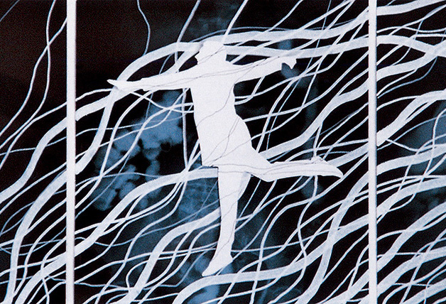 Il s’agit d’une œuvre récente, réalisée en 2014 qui est accrochée en façade sur la cloison centrale. Trois radiographies sont liées par un jeu de lignes et par deux failles verticales. Un personnage est comme en apesanteur, dansant sur des