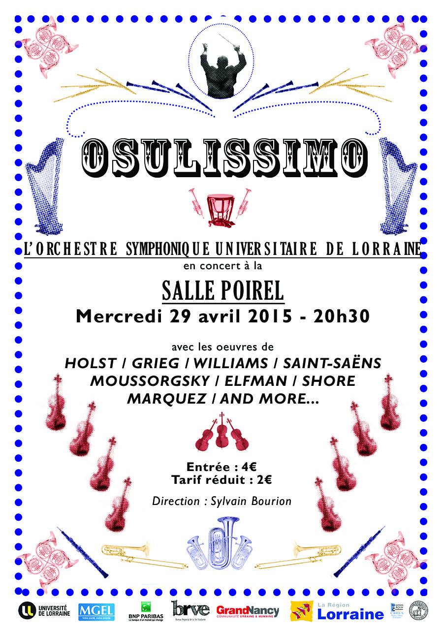 L'Orchestre Symphonique Universitaire de Lorraine donne son concert annuel à la salle Poirel de Nancy ce mercredi 29 avril à 20h30. Moussorgsky, le Seigneur des anneaux, Holst, Harry Potter et bien d'autres seront à l'honneur pour ce concert "Osulissimo" !