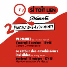 - Première soirée : Cinéma avec la projection du film "Vermines" le 04 octobre 2024 à 19h45 au Caméo Commanderie suivie d'un échange avec la salle.