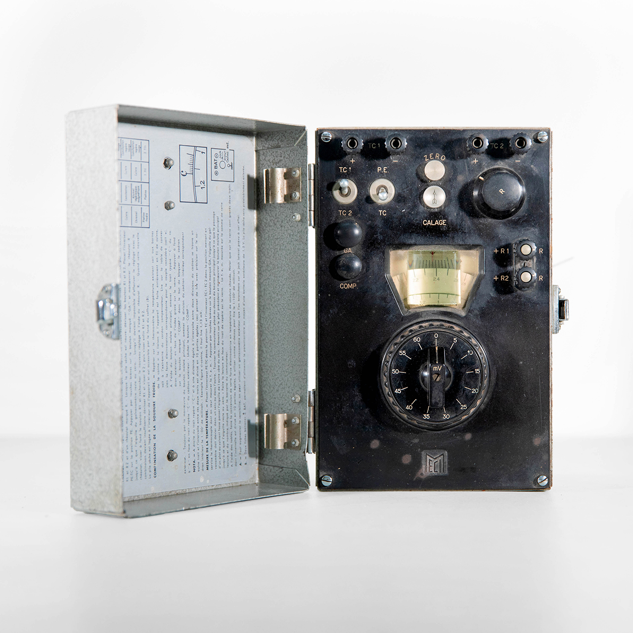 Ce pyromètre-potentiomètre portatif de marque MECI mesure des températures élevées, jusqu’à 1000 °C. Il fonctionnait grâce à une sonde thermocouple, absente ici.