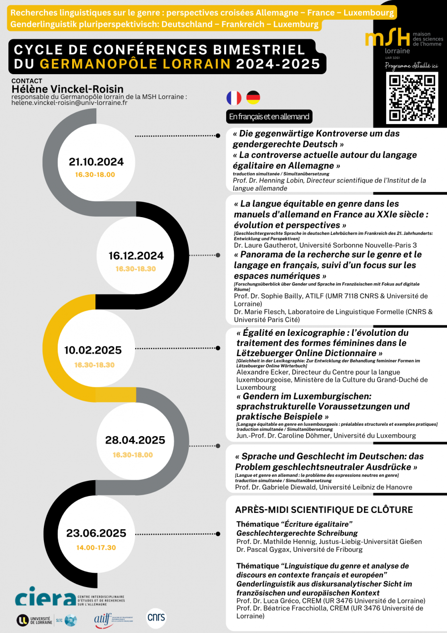 Die vom Germanopôle lorrain (Axe scientifique 1 der MSH Lorraine) organisierte Vortragsreihe soll Forscher*innen, Expert*innen dazu anregen, über aktuelle Forschungsthemen und -fragestellungen im Bereich der Genderlinguistik aus einer kontrastiven, dreisprachigen Perspektive mit einem besonderen Fokus auf die drei Grenzländer Deutschland, Frankreich und Luxemburg zu diskutieren.