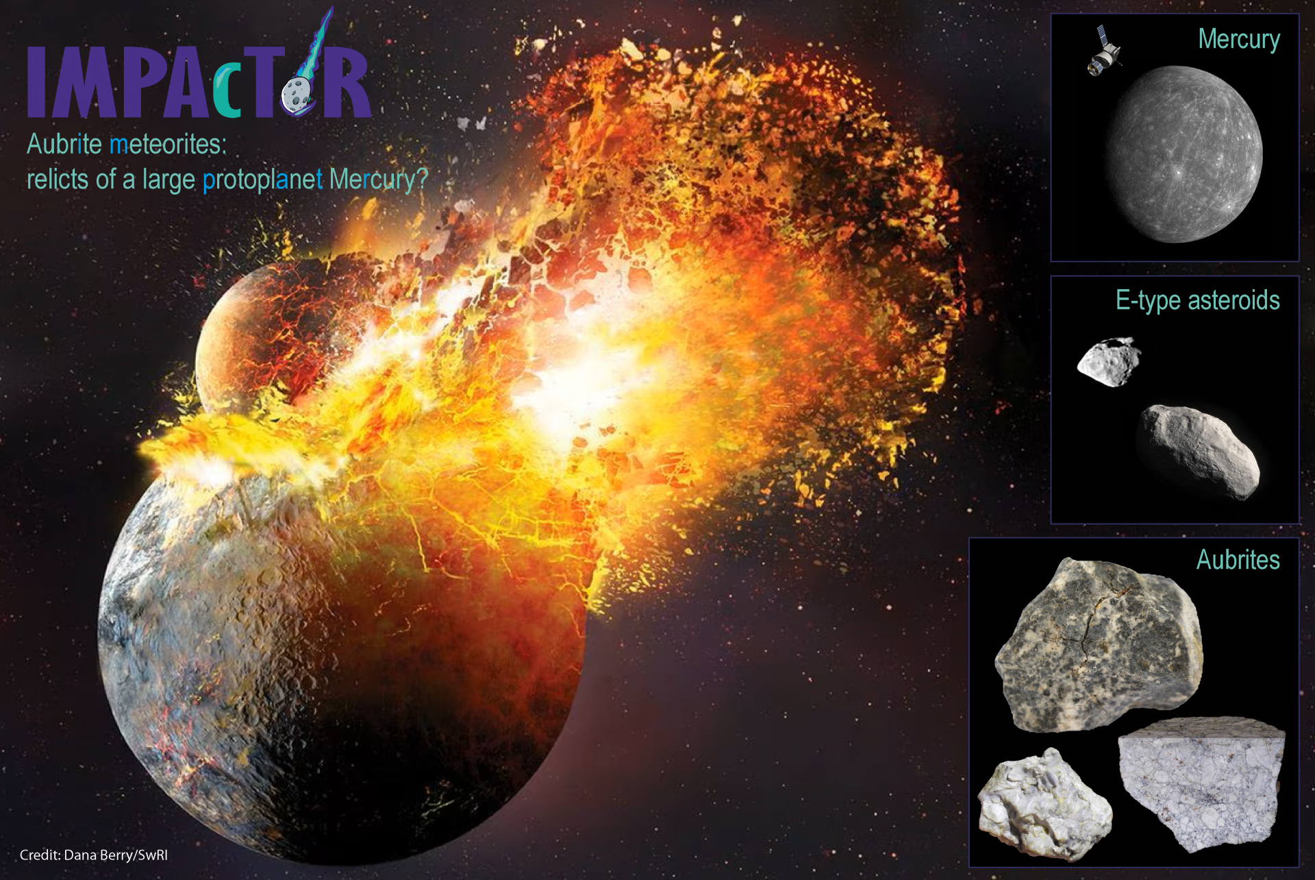 L’hypothèse que je propose est que ces astéroïdes de type E seraient en fait des débris de la planète Mercure, qui se serait formée il y a 4,6 milliards d’année beaucoup plus grosse qu’elle ne l’est actuellement, et qui aurait subi dans ses premiers millions d’années de vie un impact cataclysmique. Cet évènement aurait pulvérisé la quasi-totalité du manteau rocheux de la jeune Mercure. Une infime fraction des débris aurait ensuite fait le voyage jusqu’à la ceinture d’astéroïdes pour y devenir des astéroïdes de type E, source actuelle des météorites de type aubrite. L’objectif de mon projet ANR est de tester cette hypothèse dans tous ses aspects, grâce à une approche multi-disciplinaire.