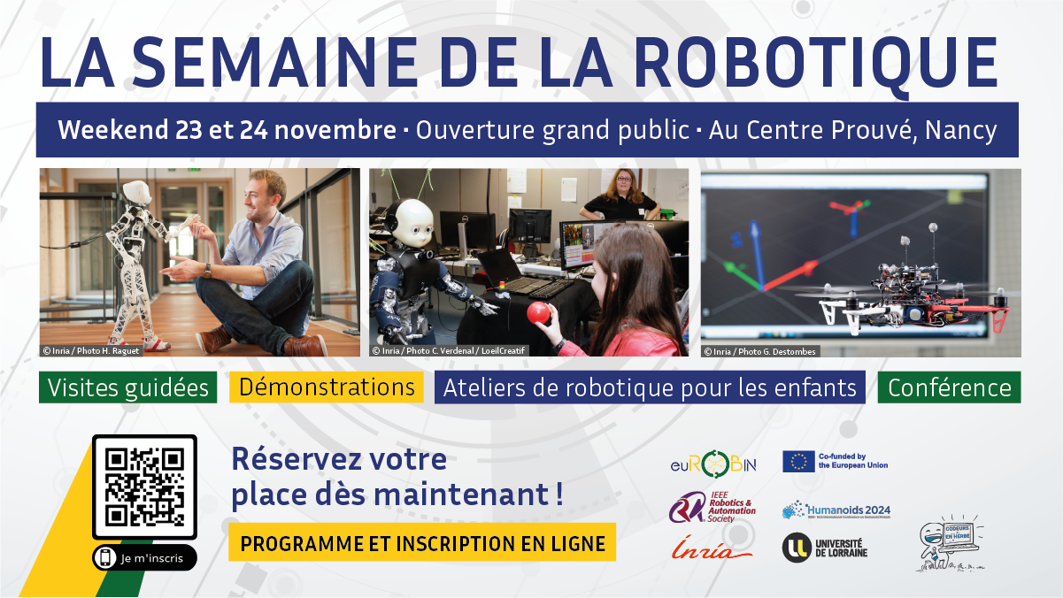Robots humanoïdes, quadrupèdes, drones, bras manipulateurs, plates-formes mobiles articulées, du vendredi 22 au jeudi 28 novembre 2024, le Centre Inria de l'Université de Lorraine vous invite à découvrir les dernières avancées technologiques internationales en matière de robotique et d'intelligence artificielle ! Instituts de recherche, universités, industriels, startups, venus du monde entier, se donneront rendez-vous à Nancy, au Centre des congrès Prouvé, pour une semaine hors du commun : "La semaine de la robotique" !