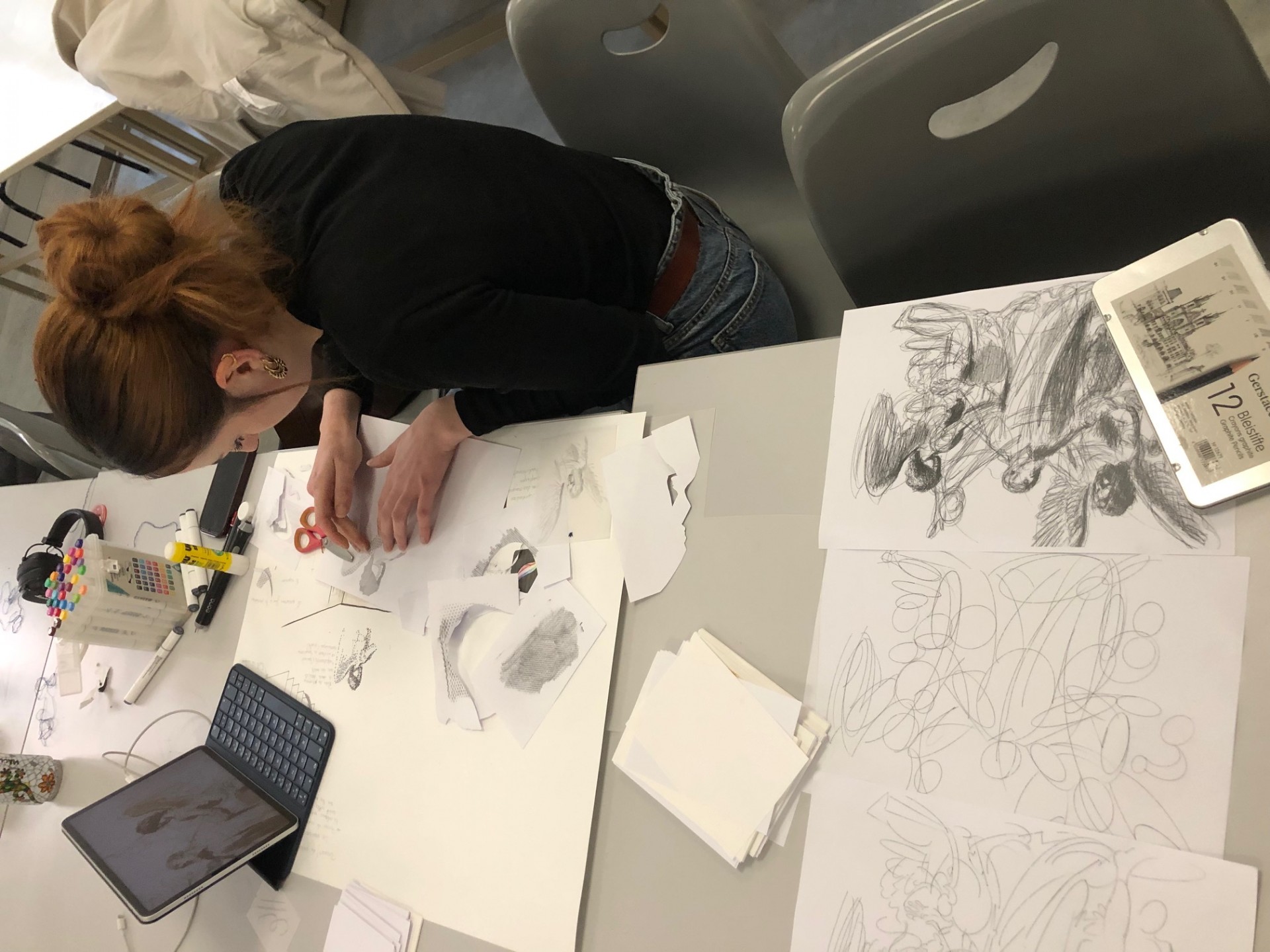 Pour chaque exposition, trois étudiantes proposent un projet de création artistique et envisagent sur la même planche sa mise en espace.