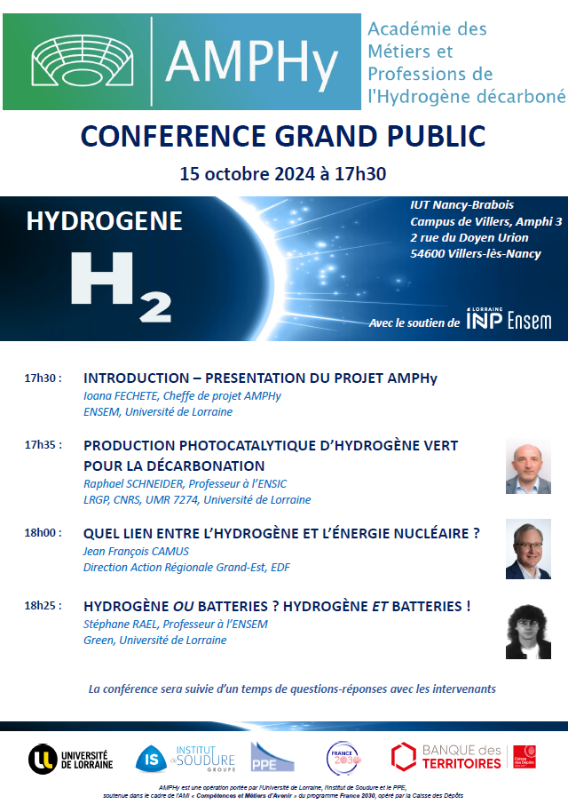 Dans le cadre du projet AMPHy, Académie des Métiers et Professions de l'Hydrogène décarboné, nous organisons une conférence grand public sur certains aspects de la filière hydrogène avec 3 courtes interventions suivies d'échanges avec la salle.