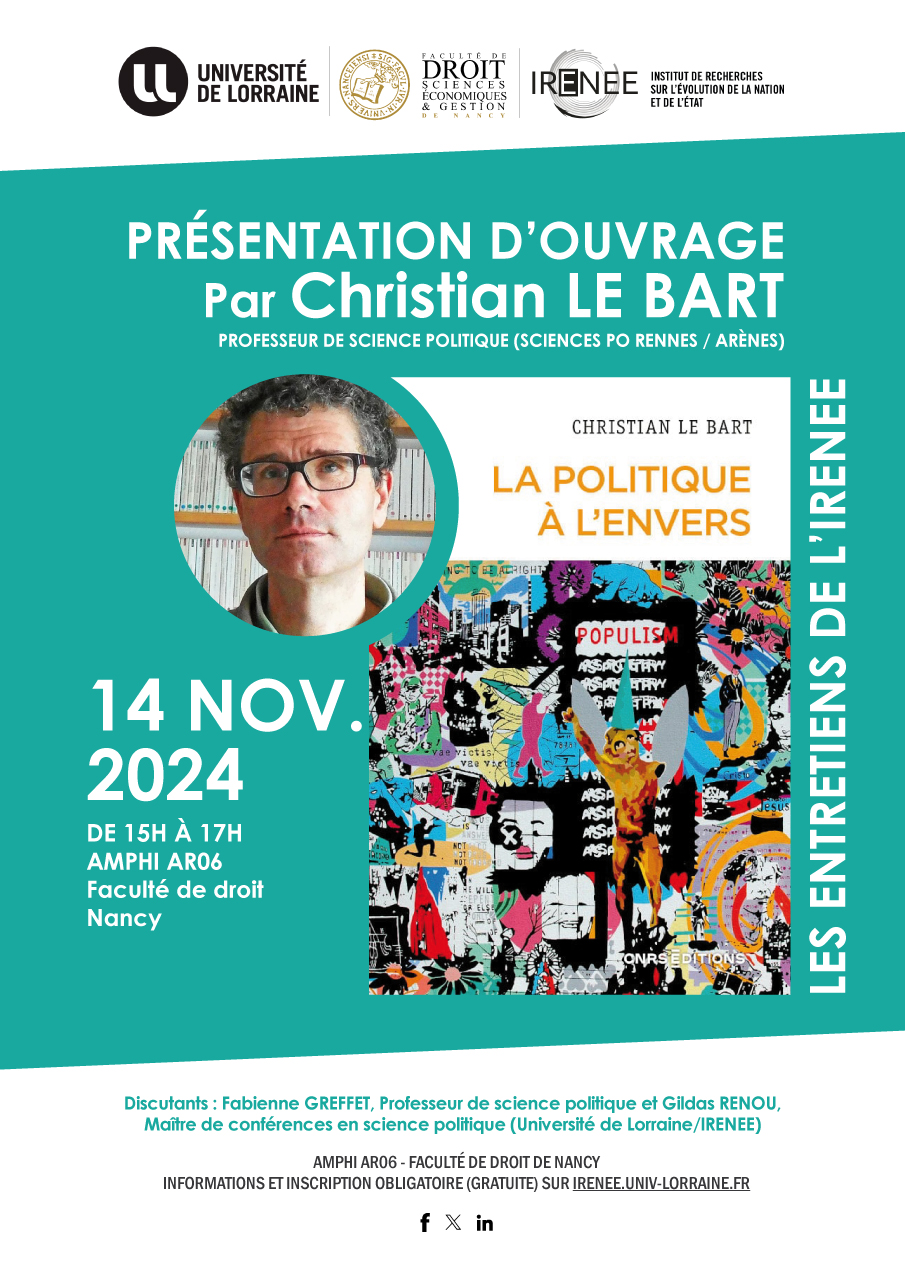 Présentation de l'ouvrage "La politique à l'envers - Essai sur le déclin de l’autonomie du champ politique" (éd. CNRS 2024) par Christian Le BART, Professeur de science politique (Sciences Po Rennes / ARENES).