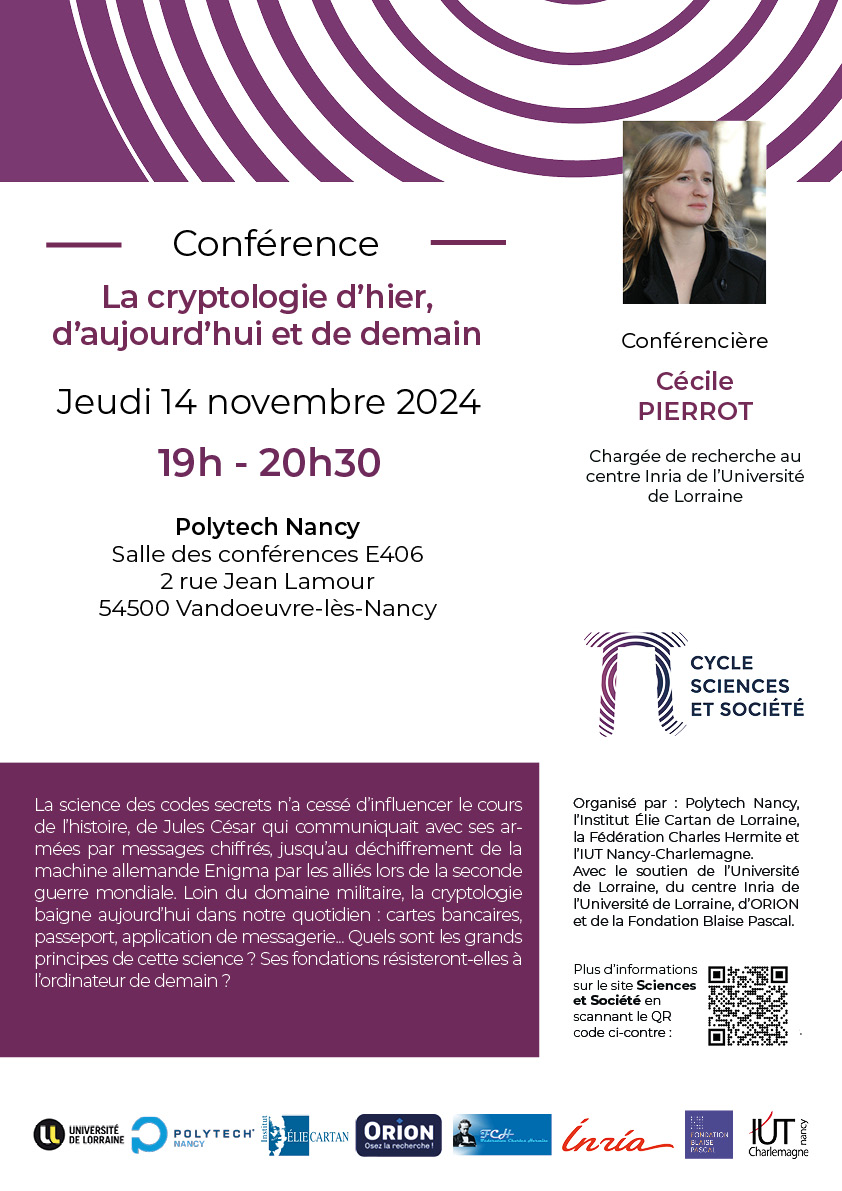 Nous aurons le plaisir d'accueillir Cécile Pierrot, Chargée de recherche à l'Inria de l'Université de Lorraine. Sa présentation est intitulée "La cryptologie d'hier, d'aujourd'hui et de demain".