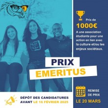 L'association Émérites.Lorraine et l'Université de Lorraine s'associent pour lancer la deuxième édition du Prix Emeritus, qui vise à récompenser des initiatives étudiantes particulièrement remarquables dans les domaines de la culture et/ou des enjeux sociétaux. Le prix 2024/2025, d'un montant de 1000 € , sera décerné le 20 mars 2025 lors de l'assemblée générale de l'association.