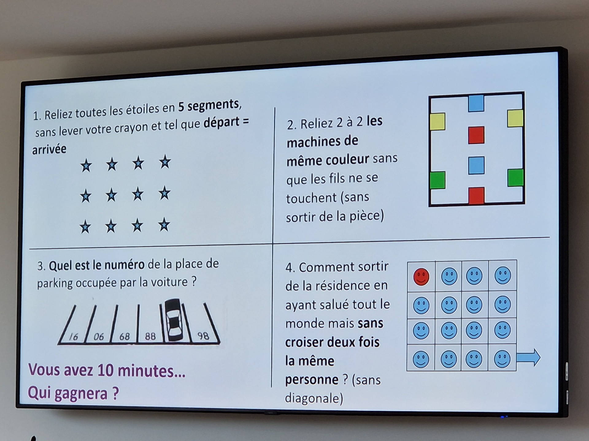 Après une présentation des intervenants (Michael Benedic à Nancy et Thierno Diallo à Metz), la culture entrepreneuriale des étudiant.es a été testée sous forme d’énigmes (avec lots gagnants à la clé !) L’entrepreneuriat c’est savoir sortir du cadre (énigme 1), savoir prendre le problème sous un autre angle (énigme 2), avoir une flexibilité d’esprit, pouvoir multiplier les points de vue (énigme 3) et accepter de revenir en arrière (énigme 4).