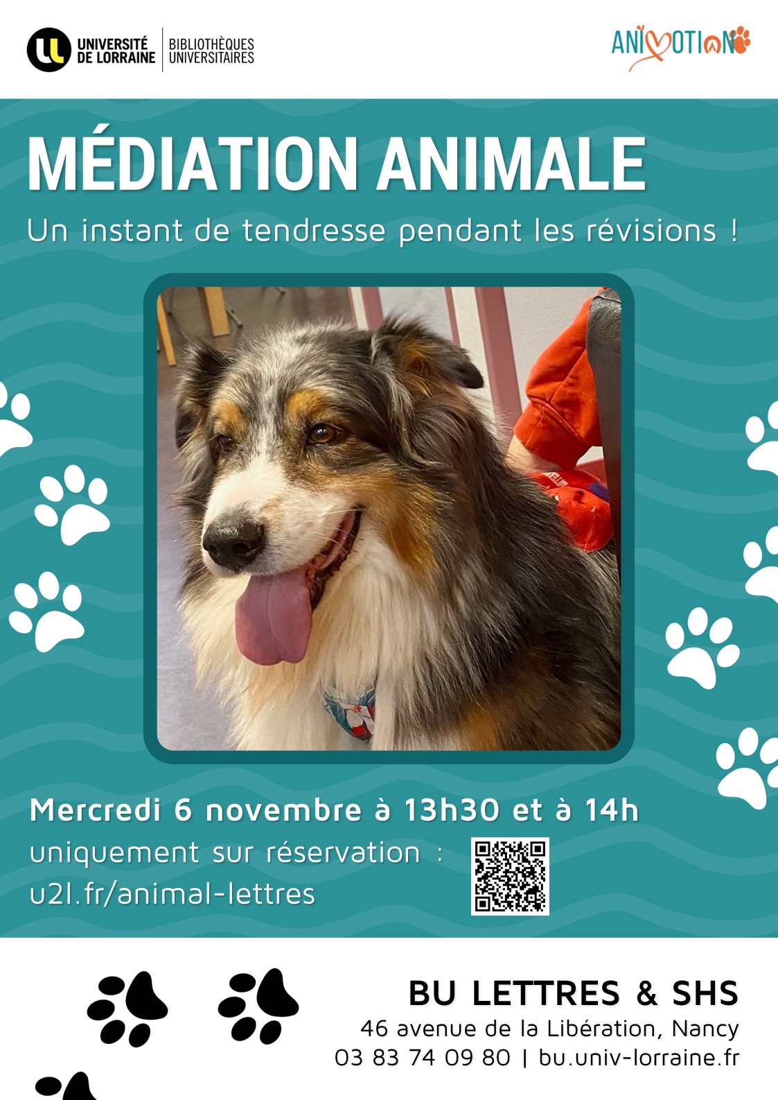 Les révisions ? Bas les pattes ! La BU Lettres et SHS vous propose deux séances de médiation animale, le 6 novembre 2024, à 13h30 et à 14h, pour faire le plein de détente entre deux cours.