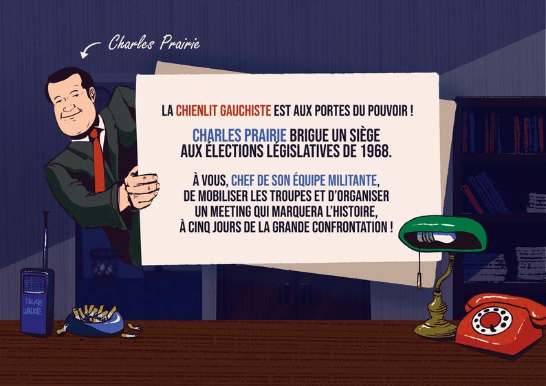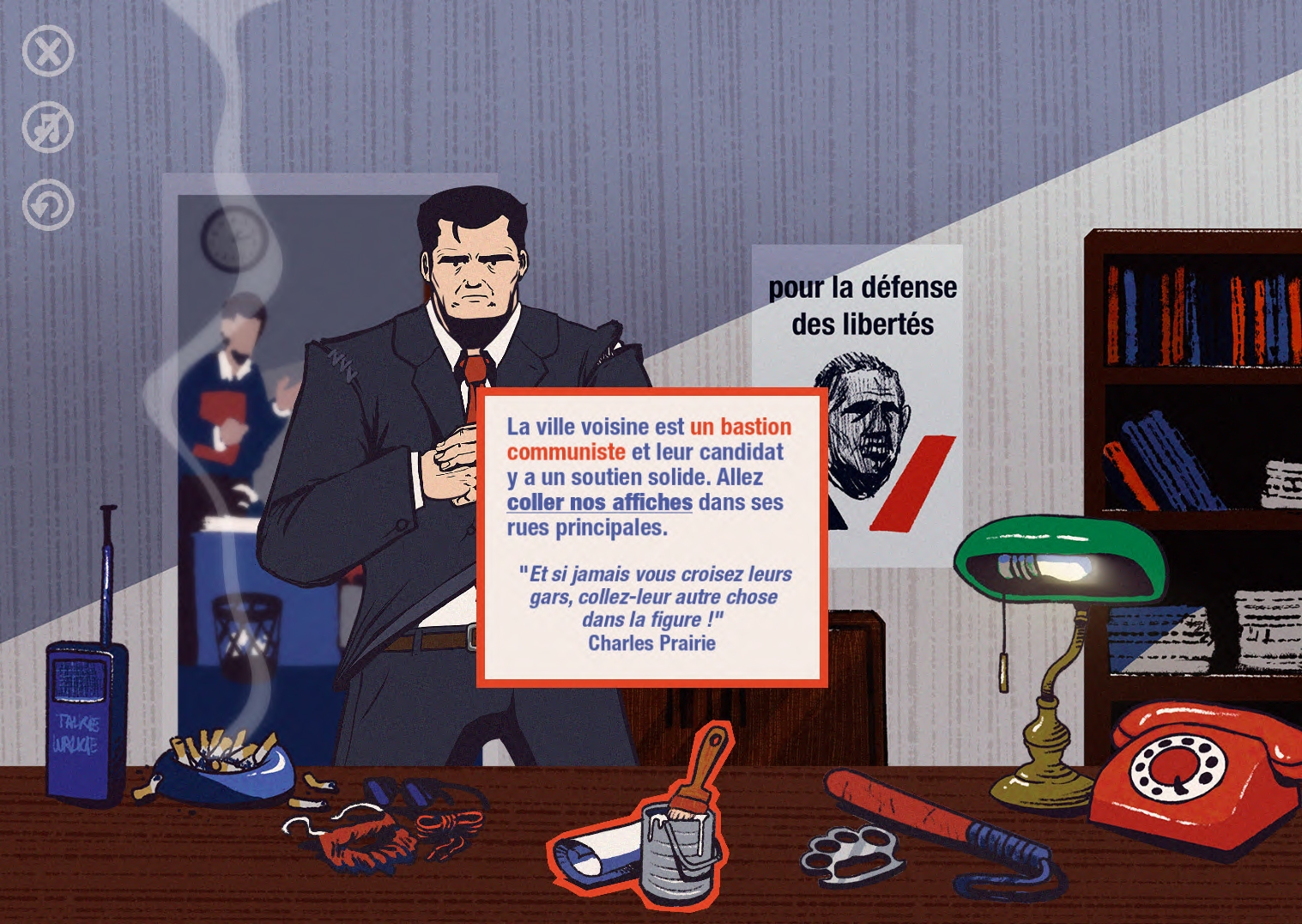 Ce n’est pas un exercice simple. J’ai discuté trois bonnes heures avec les membres de mon équipe pour savoir quelle(s) partie(s) de ma thèse devrait être valorisée et quel type de jeu serait le plus approprié pour l’adapter. Ma thèse portait sur l’histoire du gaullisme et de la violence militante durant les années 1968. Nous avons convenu très rapidement que le plus logique serait de se concentrer sur les élections législatives de juin 1968. Les gaullistes étaient impliqués dans de très nombreux incidents à l’époque. Concernant le gameplay, j’avais proposé de s’inspirer de Papers, please. Ce dernier étant riche malgré son gameplay en apparence simple, un membre de l’équipe a proposé de prendre l’exemple d’un autre jeu au gameplay similaire mais moins chargé qui serait plus facile à produire en 48 heures. Cela avait ainsi l’avantage de permettre aux joueurs d’avoir une prise en main simple et rapide, d’avoir des fenêtres de dialogue offrant des informations authentiques – avec des personnages fictifs bien qu’inspirés de personnes réelles –, de choisir des actions militantes ayant réellement existées… et d’avoir aussi des résultats tout aussi réels et sourcés !