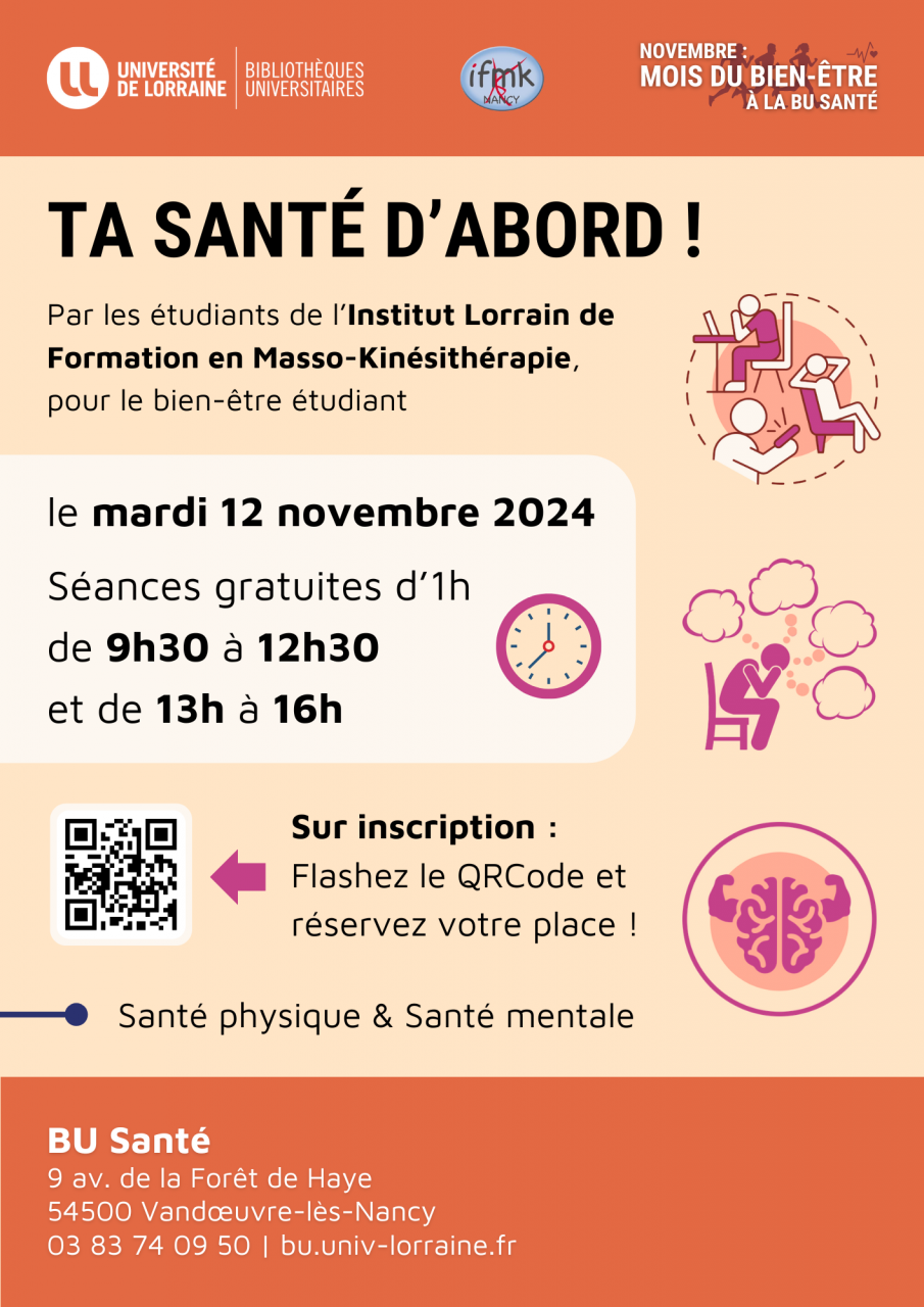 Dans le cadre de "Novembre, mois du bien-être" à la BU Santé, nous accueillons les étudiants de l’Institut Lorrain de Formation en Masso-Kinésithérapie le 12 novembre 2024 pour des séances destinées au bien-être étudiant.