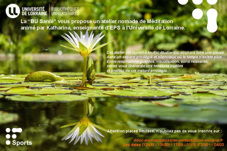 Animé par Katharina, enseignante d'EPS à l'Université de Lorraine, cet atelier vous plongera dans une bulle hors du temps pour retrouver la sérénité à l'aide de respirations guidées, visualisation et sons relaxants.