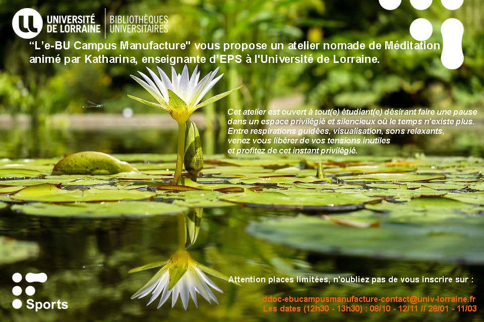 Animé par Katharina, enseignante d'EPS à l'Université de Lorraine, cet atelier vous plongera dans une bulle hors du temps pour retrouver la sérénité à l'aide de respirations guidées, visualisation et sons relaxants.