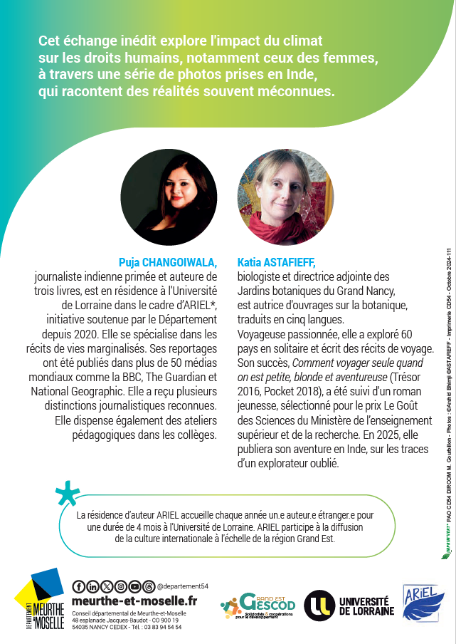 Les autrices Puja Changoiwala et Katia Astafieff participeront au Marché du Monde Solidaire à Nancy pour échanger sur les récits des hommes et des femmes face au changement climatique en Inde, en mettant l’accent sur l’importance du storytelling pour sensibiliser les populations. La résidence ARIEL et le Conseil Départemental 54 seront ravis de vous accueillir pour cette rencontre interculturelle dédiée au climat et à la narration littéraire le dimanche 17 novembre à l’Hôtel du Département, 48 esplanade Jacques Baudot à Nancy (entrée libre), de 14h à 15h30.