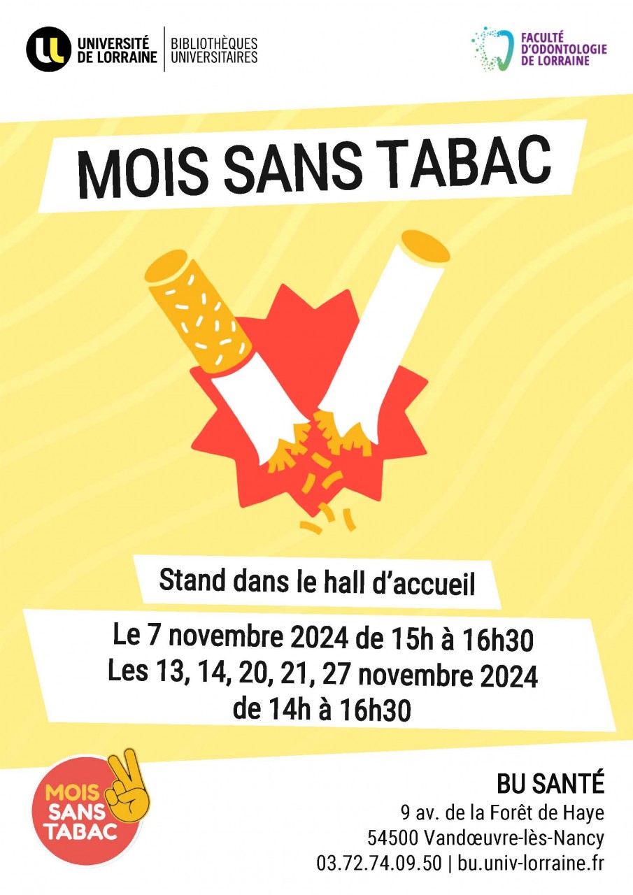 Un stand d'information et de sensibilisation sur le tabagisme sera proposé dans le hall de la BU Santé, le 7 novembre 2024 de 15h à 16h30 et les 13, 14, 20, 21, 27 novembre 2024 de 14h à 16h30, à l’occasion du mois sans tabac.