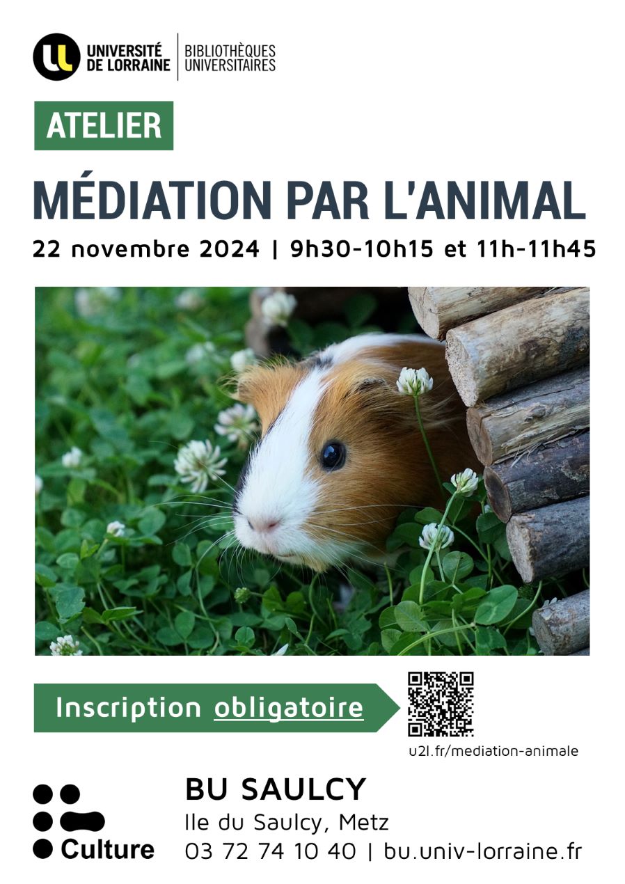 La BU Saulcy vous propose un atelier de médiation (Salle silence, 1er étage de la BU), animé par une intervenante de l'Association Académie Poils aux Pattes.