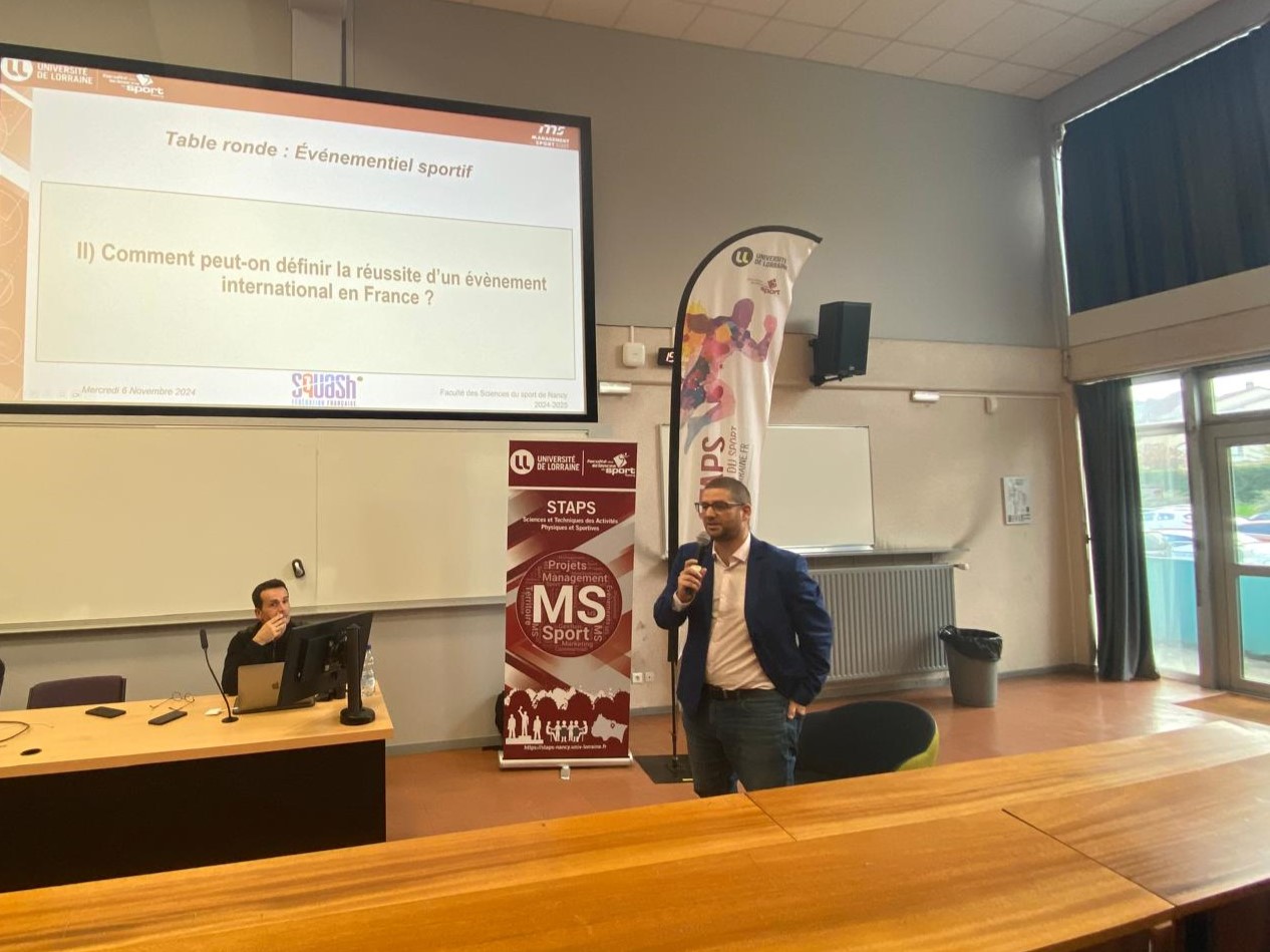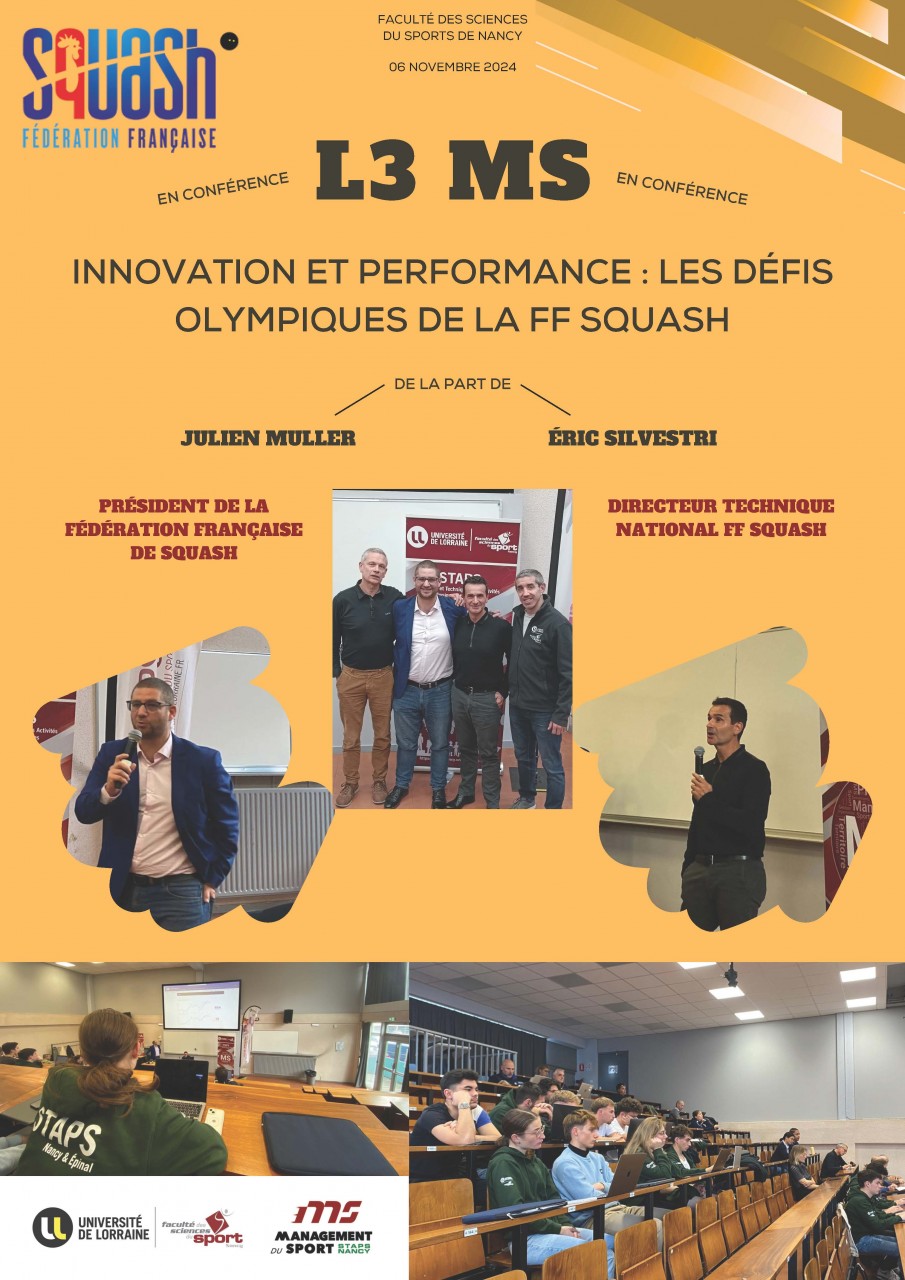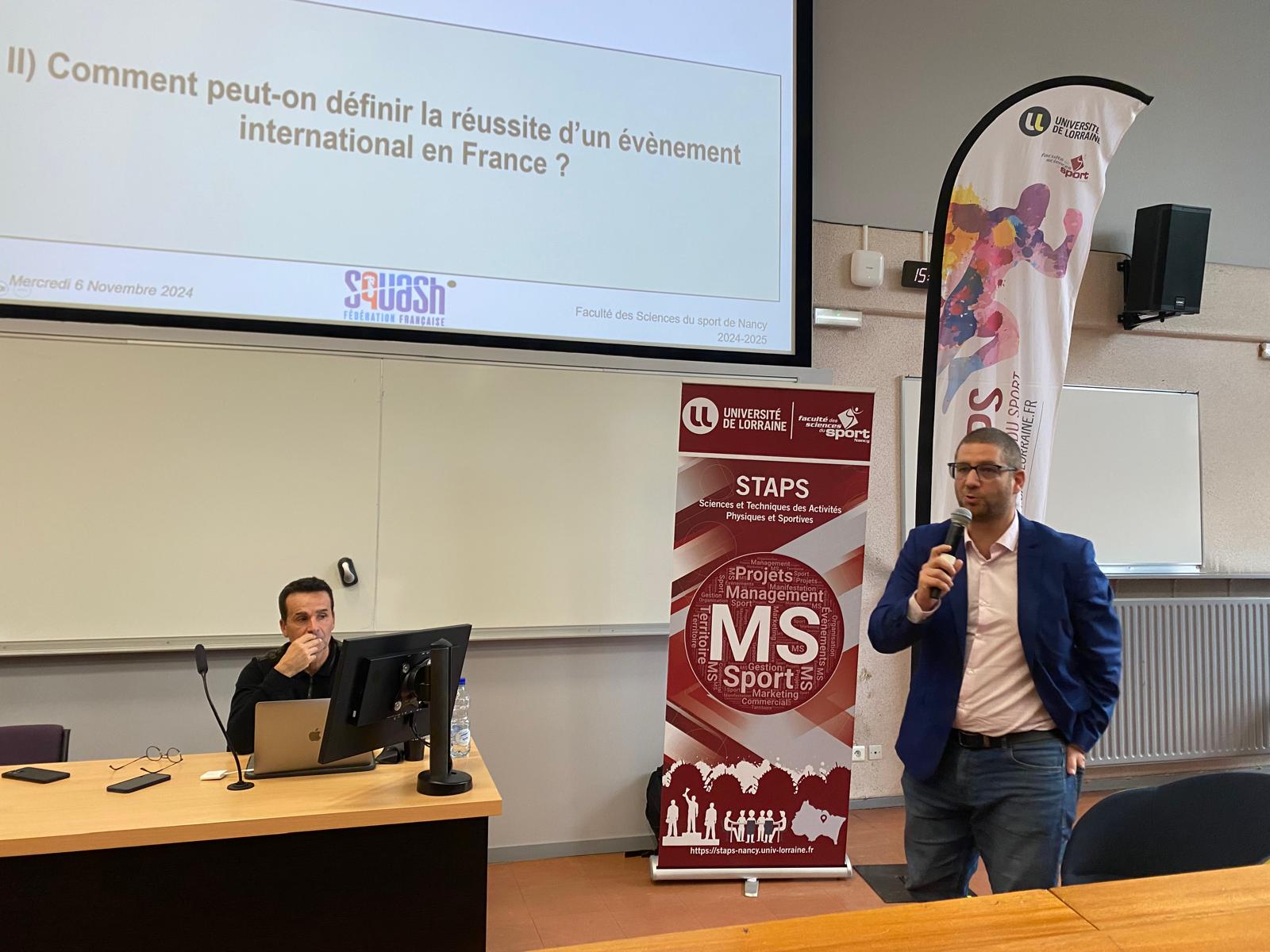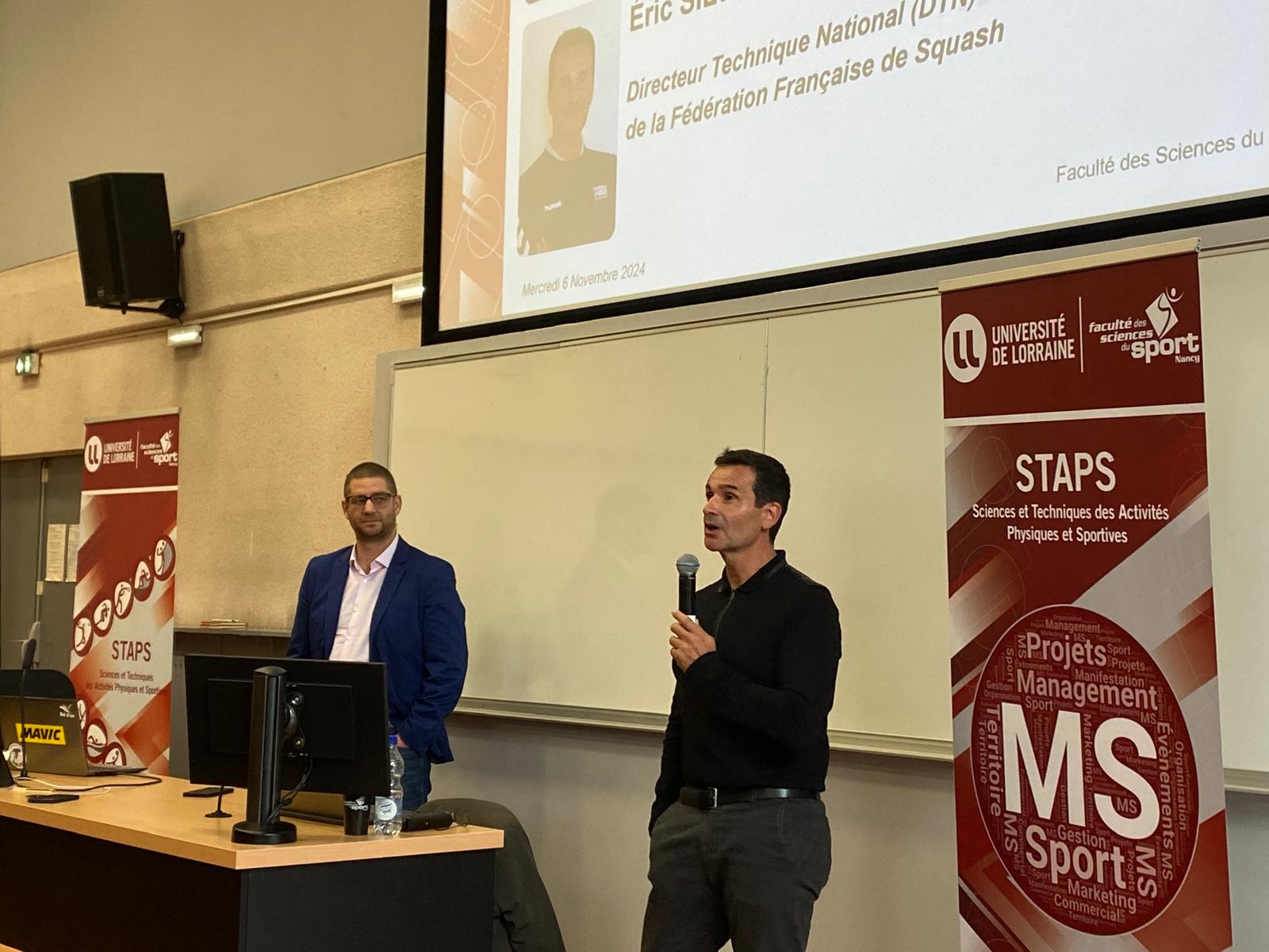 Mercredi 6 novembre 2024, les étudiants en 3e année de licence Management du sport de la Faculté des sciences du sport de Nancy ont eu l’opportunité de plonger au cœur de l’innovation sportive lors d’une conférence exceptionnelle intitulée « Innovation et performance : les défis olympiques de la FF Squash ». L’événement, organisé par la Faculté des sciences du sport, a rassemblé deux figures majeures de la Fédération Française de Squash : Julien Muller, président de la FF Squash, et Éric Silvestri, directeur technique national. Ces invités de marque ont offert aux étudiants un aperçu unique des défis auxquels est confrontée cette discipline, encore méconnue en France malgré une popularité mondiale.