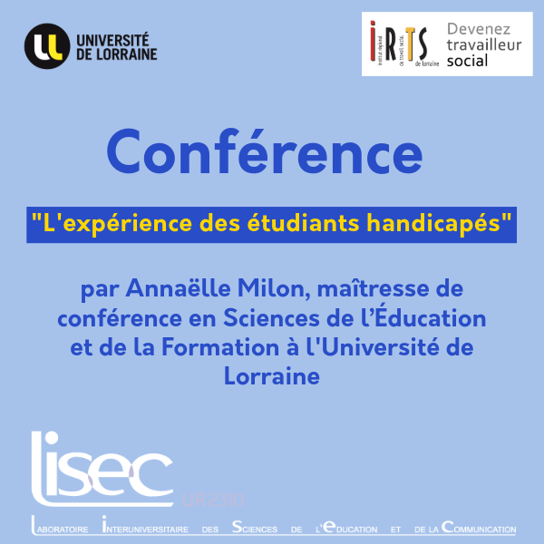 Ce lundi 18 novembre, venez assister à la conférence "L'expérience des étudiants handicapés" par Annaëlle Milon, maîtresse de conférence en Sciences de l’Éducation et de la Formation à l'Université de Lorraine - LISEC.