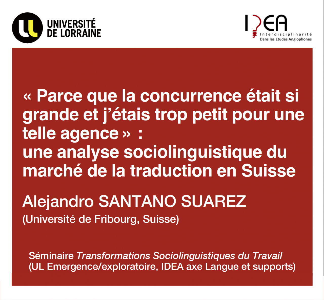 La prochaine séance du séminaire « Transformations Sociolinguistiques du Travail » aura lieu le lundi 25 novembre prochain, de 16h à 17h30, sur le Campus du Saulcy, Metz. Lors de cette séance, Alejandro Santano Suarez (Université de Fribourg, Suisse) interviendra pour faire une communication intitulée « 'Parce que la concurrence était si grande et j’étais trop petit pour une telle agence': une analyse sociolinguistique du marché de la traduction en Suisse »