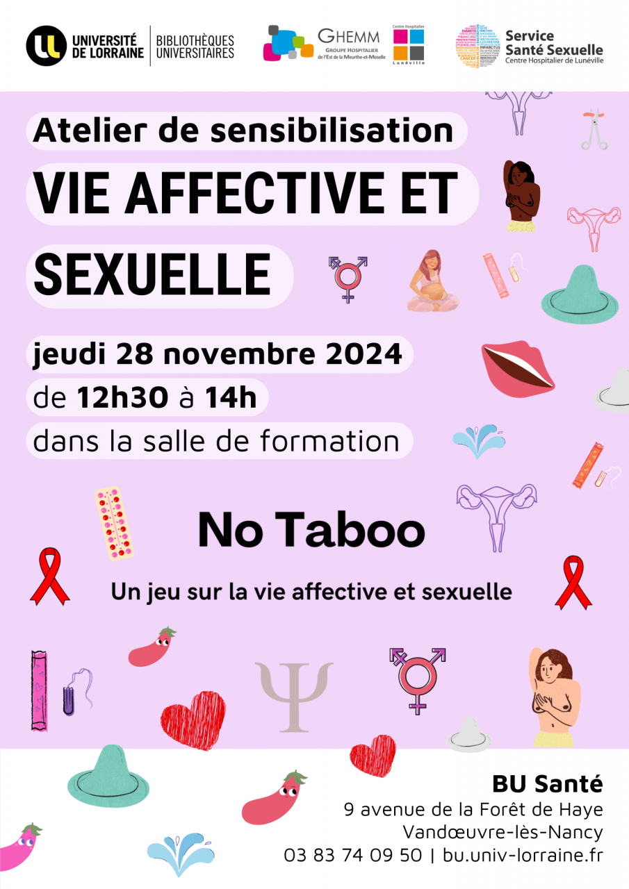 La BU Santé, en collaboration avec le Service de Santé Sexuelle, hôpital de Lunéville, le Groupe Hospitalier de l’Est de la Meurthe et Moselle, vous propose un atelier de sensibilisation autour de la vie affective et sexuelle, le jeudi 28 novembre 2024 de 12h30 à 14h.