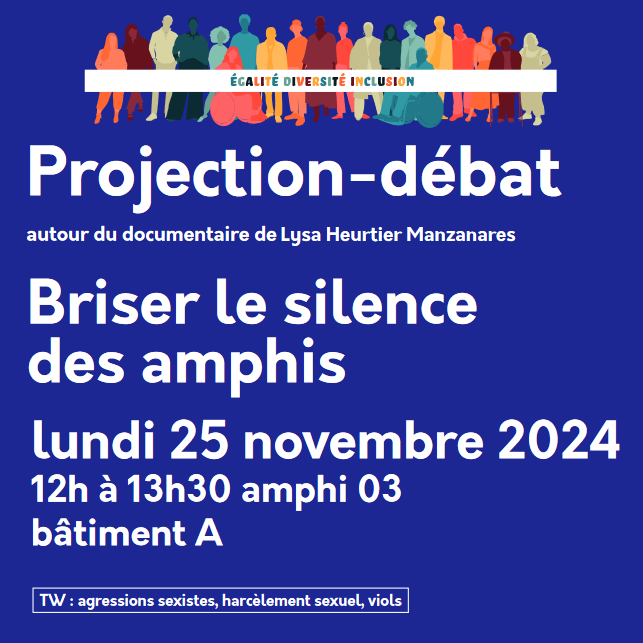Le 25 novembre marque la Journée internationale de lutte contre les violences faites aux femmes. À cette occasion, la cellule Égalité, Diversité, Inclusion de l'UFR Arts, Lettres et Langues organise la projection d'un documentaire intitulé Briser le silence des amphis.