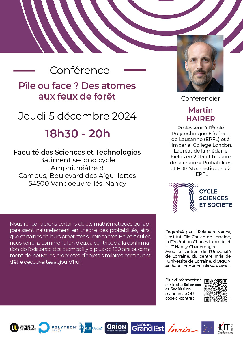 Sciences et Société a le plaisir de recevoir Martin Hairer, lauréat de la Médaille Fields en 2014, pour une conférence exceptionnelle jeudi 5 décembre qui a pour titre : Pile ou face ? Des atomes aux feux de forêt. Martin Hairer est Professeur à l'Imperial College London et à l'École Polytechnique Fédérale de Lausanne (EPFL) où il est titulaire de la chaire "Probabilités et EDP Stochastiques". Sa conférence aura lieu à 18h30 dans l'amphithéâtre 8 du Bâtiment second cycle de la Faculté des Sciences et Technologies.