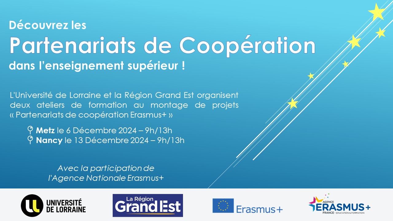 On vous rappelle les ateliers menés par la S-Dipro de l’UL et la Région Grand Est avec la participation de l’Agence Erasmus+ sur les Partenariats de Coopération Erasmus+ le 6 décembre à Metz et le 13 décembre à Nacy. Voici les liens pour votre inscription :
