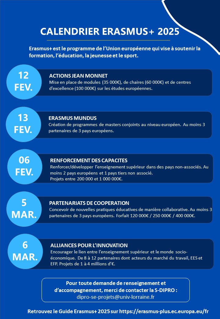 Pour plus de renseignement et pour être accompagné dans le montage, le dépôt et le suivi de vos projets, contactez la S-DIPRO : dipro-se-projets@univ-lorraine.fr