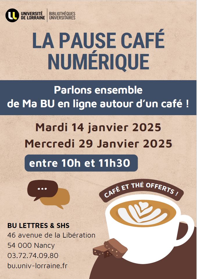 La BU Lettres, Sciences Humaines et Sociales de Nancy organise une Pause café numérique pour les étudiant·e·s.