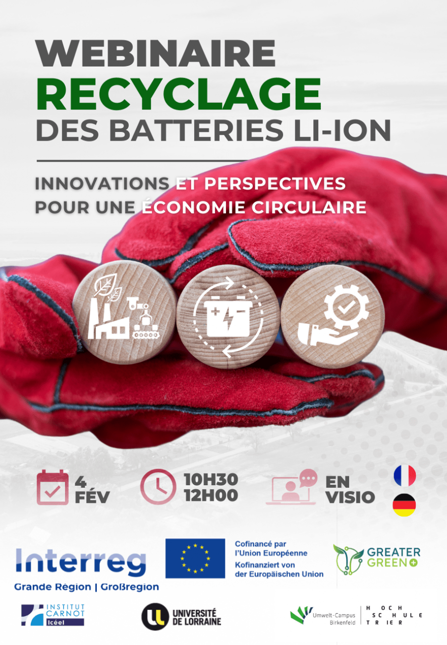 Dans le cadre du projet européen Greater Green+, le Carnot Icéel et l' Umwelt-Campus Birkenfeld vous invitent à assister à un webinaire traitant du recyclage des batteries Lithium-Ion.