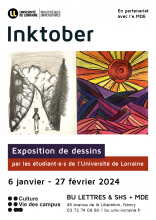 L'exposition « Inktober » vous propose de découvrir les dessins des étudiant·e·s de l'Université de Lorraine créés lors du défi d'un dessin par jour en octobre 2023 et 2024. Ce défi, animé par la e.MDE, a rassemblé plusieurs productions dessinées des étudiant·e·s qui peuvent également être retrouvées sur le serveur Discord « Vie étudiante UL ».