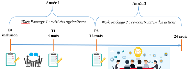 Le projet CAGRIMENT comprend deux volets qui dureront chacun un an. Le premier consiste en la diffusion d'un questionnaire en ligne aux exploitants actifs et retraités, et salariés agricoles à trois temps de mesure (inclusion, 6 mois et 12 mois). Le deuxième volet vise à co-construire des actions de promotion de la santé mentale dans le monde agricole, en se basant sur les données recueillies lors du volet 1, et sur les savoirs expérientiels de différents acteurs du monde agricole (e.g., exploitants, associations, syndicats, organismes mutualistes, agence régionale de santé, professionnels de la santé, chercheurs en santé publique). Cette étape de co-construction se déroulera sous la forme de séminaires avec les acteurs du monde agricole.