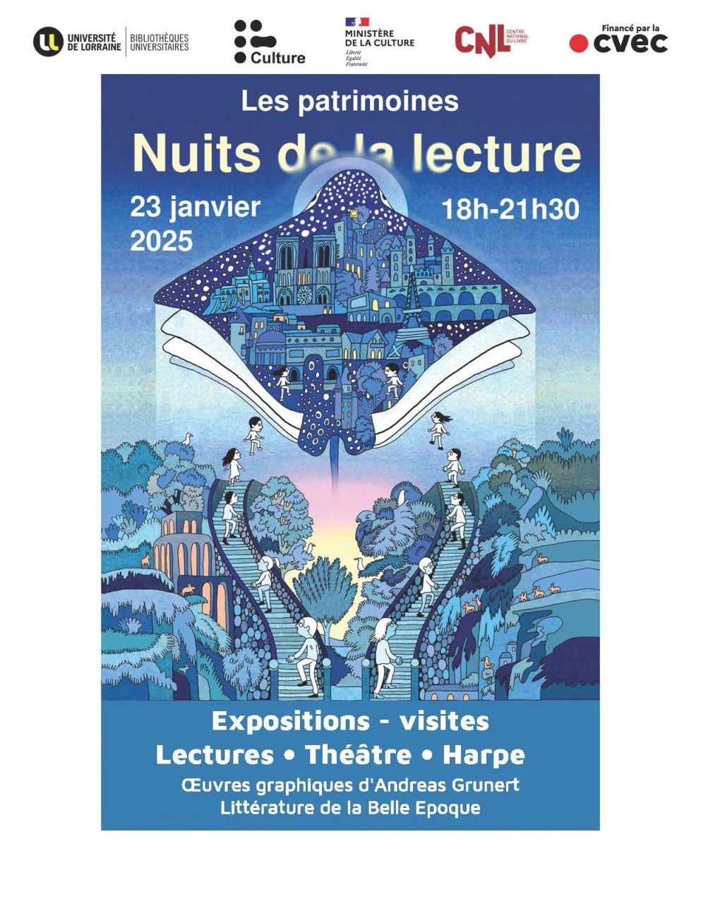 - 19h : lectures théâtralisées par la compagnie « La Chimère* » et des étudiants du Théâtre Universitaire de Metz (TUM)** ; improvisations musicales par la harpiste professionnelle Anne-Gaëlle Cuif