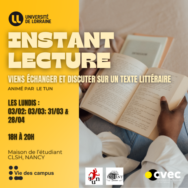 Le Théâtre Universitaire de Nancy t'invite à venir discuter, découvrir et débattre de textes en tous genres. Avec un thème par mois, tu peux également ramener des textes que tu aimerais partager.