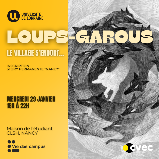 À la nuit tombée, le mercredi 29 janvier, viens participer à la soirée du Pacte des Loups-Garous de Thiercelieux… et cette fois-ci, tu ne seras pas seul : un conteur pro sera là pour rythmer ta soirée. Alors prêt ? Le village s’endort…