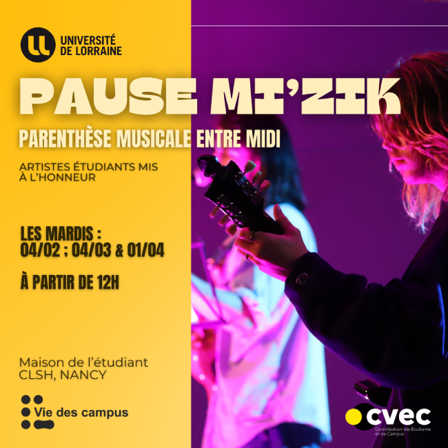 Rejoins-nous pour une Pause Mi'Zik chaque premier mardi du mois où nos artistes étudiant·e·s seront mis en lumière !