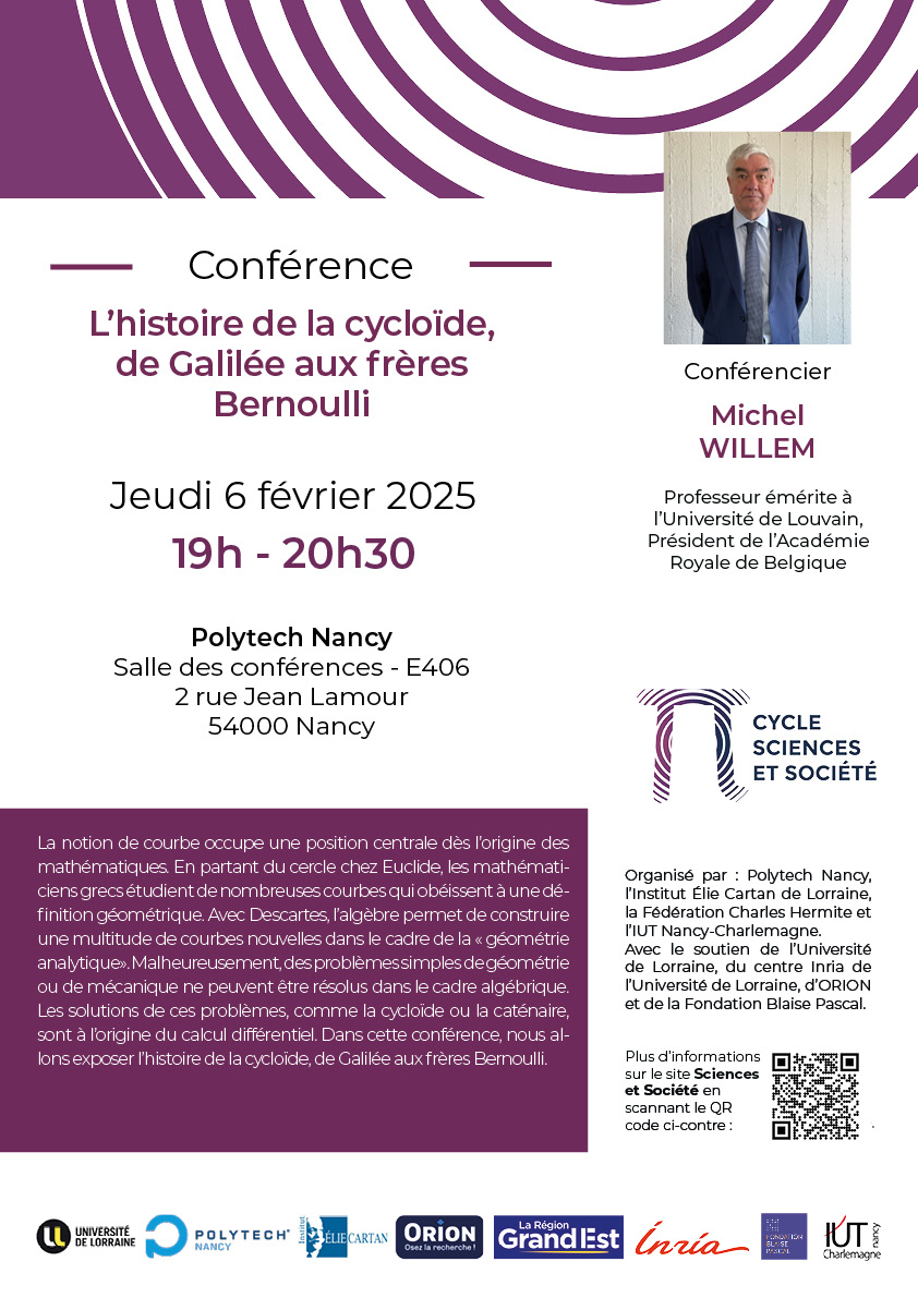 La prochaine conférence Sciences & Société aura lieu jeudi 6 février 2025 à Polytech Nancy dans la salle des conférences (E406) à 19h. Nous aurons le plaisir d'accueillir Michel Willem, Professeur émérite à l'Université de Louvain et Président de l'Académie Royale de Belgique, qui donnera une conférence sur le thème suivant : L'histoire de la cycloïde, de Galilée aux frères Bernoulli.