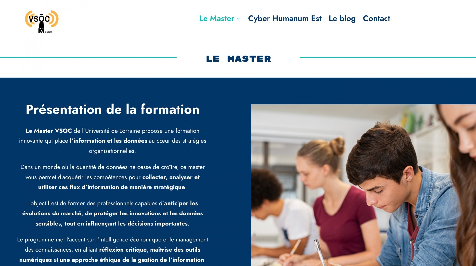 Conçu et réalisé par les étudiants de deuxième année dans le cadre d’un projet pédagogique, ce site répond à un double objectif : accroître la visibilité du master et offrir une présentation claire et complète de ses spécificités.
