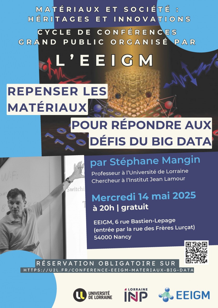 Le mercredi 14 mai à 20h00, dans le cadre de son cycle de conférences grand public "Matériaux et société : héritages et innovations", l'Ecole européenne d'ingénieurs en génie des matériaux a le plaisir de recevoir Stéphane Mangin, Professeur à l'Université de Lorraine et chercheur à l'Institut Jean Lamour pour sa présentation intitulée : "Repenser les matériaux pour répondre aux défis du big data".