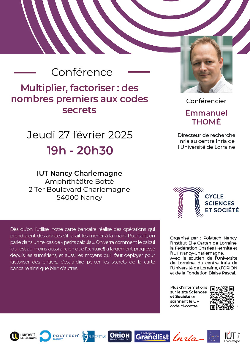Nous serons heureux d'accueillir Emmanuel Thomé, Directeur de recherche Inria au Centre Inria de l'Université de Lorraine et au Loria. Sa présentation est intitulée : Multiplier, factoriser : des nombres premiers aux codes secrets.
