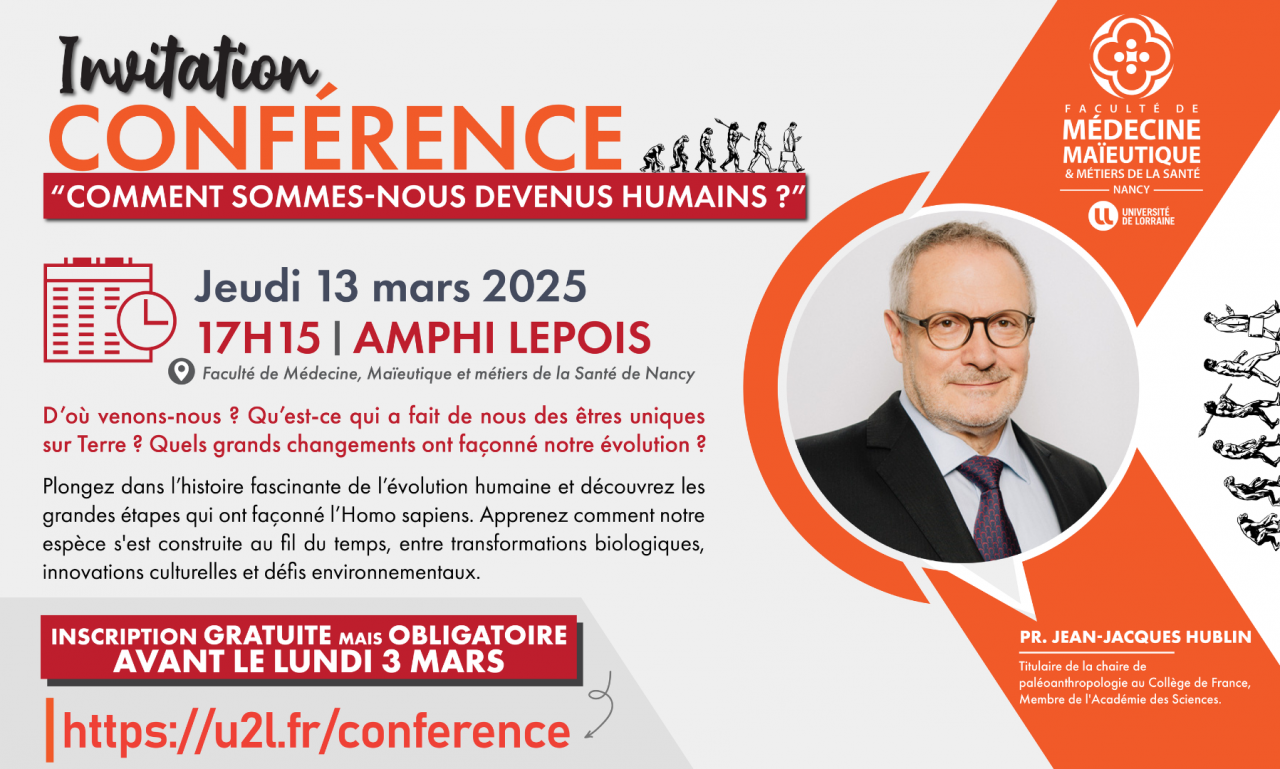 La faculté de Médecine, Maïeutique et métiers de la Santé de Nancy a le plaisir de vous inviter à une conférence passionnante animée par le Pr. Jean-Jacques Hublin, paléoanthropologue de renom, titulaire de la chaire de paléoanthropologie au Collège de France et membre de l'Académie des Sciences.
