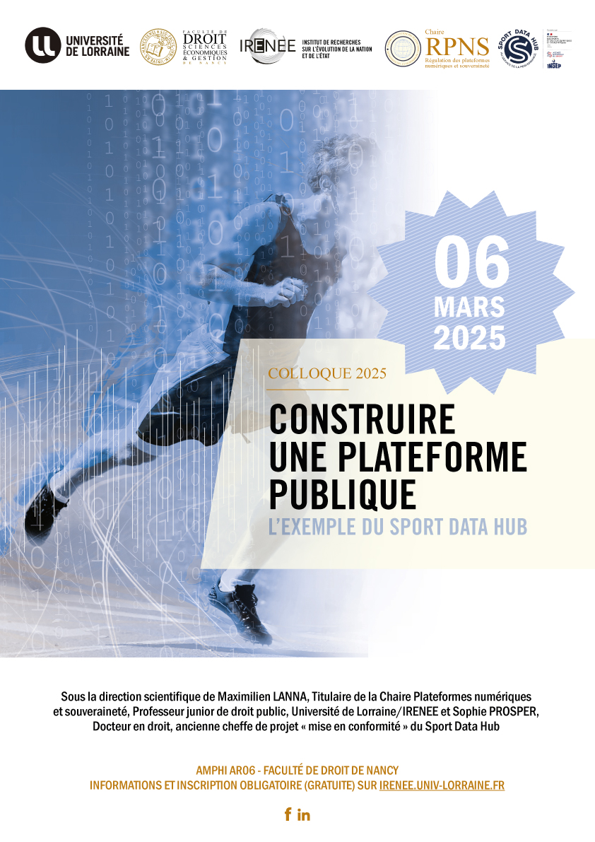 Le colloque organisé par la Chaire sur la Régulation des plateformes numériques et souveraineté de l’IRENEE – Université de Lorraine, et le Sport Data Hub, entend mettre en lumière les enjeux juridiques relatifs à la construction et à la mise en œuvre d’une plateforme publique.