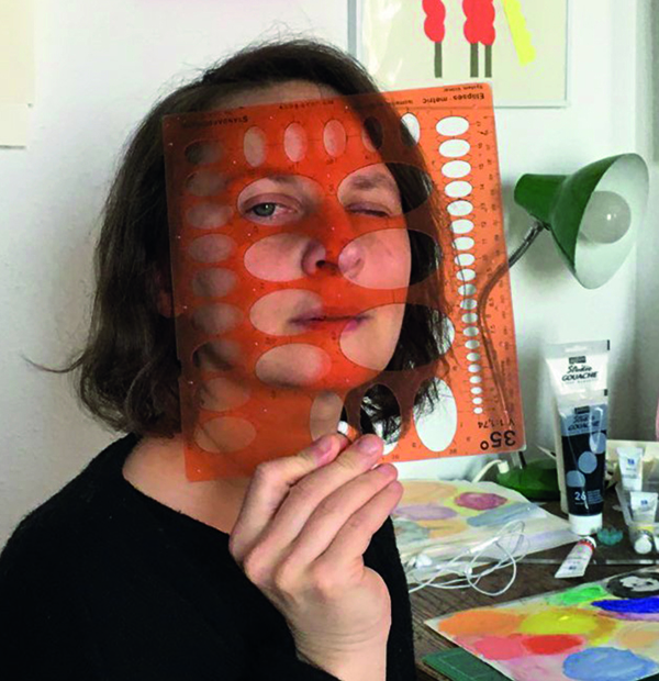 "Avec son premier album Coucou Cucu, édité aux Éditions L’Articho, Frédérique Rusch détonne dans l’univers des livres jeunesse par son style minimaliste. Pour dessiner, elle utilise un objet disparu des cartables, le normographe. Cet outil lui permet de créer un langage graphique géométrique et coloré qui se déploie volontiers dans l’espace. Oiseaux normographes, chien tapis, arbre cimaise, outils tableaux : illustration, peinture et design se mêlent pour créer un jeu narratif singulier. Quand une toile se mue en règle, en feuille de papier ou encore en gomme, Frédérique Rusch s’amuse avec les codes de l’art en donnant sa version humoristique du monochrome, tout en se jouant de notre perception. D’ailleurs, ce chien est-il un carré ou ce carré est-il un chien ?"