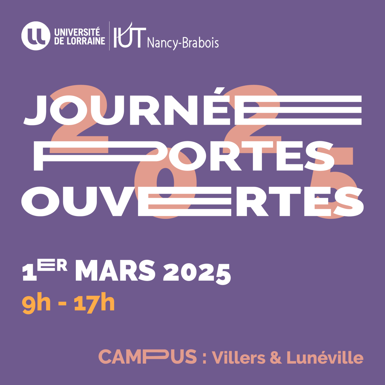 L'IUT Nancy-Brabois ouvre ses portes le 1er mars 2025 sur ses deux campus. Venez découvrir nos formations, échanger avec nos étudiants et enseignants, et plongez-vous dans votre futur lieu d'apprentissage.