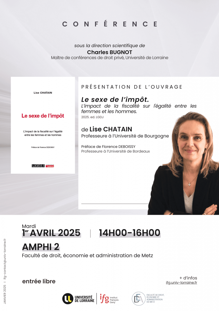 Sous la direction scientifique de Charles BUGNOT, maître de conférences à l'Université de Lorraine, Lise CHATAIN, professeure à l'Université de Bourgogne, viendra présenter son ouvrage Le sexe de l’impôt. L’impact de la fiscalité sur l'égalité entre les femmes et les hommes (2025, ed. LGDJ, préface de Florence DEBOISSY, professeure à l'Université de Bordeaux).