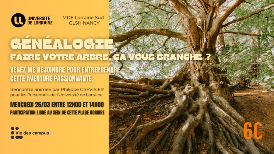 Cet événement est réservé exclusivement au personnel et à la communauté étudiante de l'Université de Lorraine (inscription via eventbrite avec le QR code ou par ce lien : https://www.eventbrite.fr/e/billets-atelier-de-genealogie-1255379025459?aff=oddtdtcreator)
