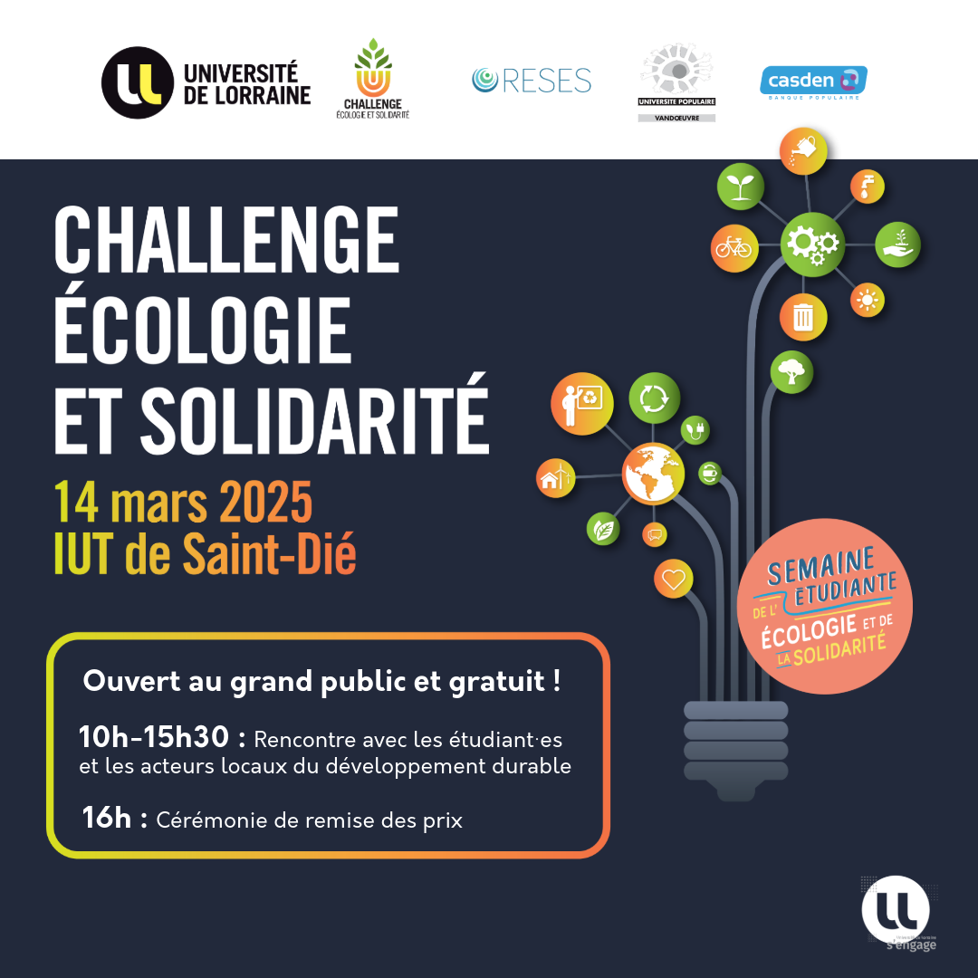 Le 14 mars 2025, l'IUT de Saint-Dié-des-Vosges accueillera la 13ème édition du concours étudiant "Challenge Ecologie & Solidarité". Cet événement réunira une trentaine de projets portés par des étudiant·es de divers horizons (IUT, écoles d'ingénieurs, universités).