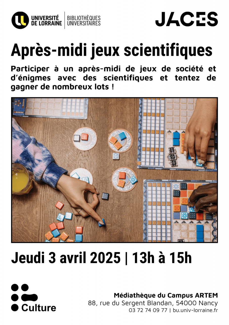 Jouer le temps d’un après-midi ça vous tente ? Durant la pause, des jeux de société, des énigmes et des mini escape-games sont à votre disposition. Ces jeux ont tous la particularité : ils ont été créés par des… scientifiques. Vous pourrez donc jouer avec leurs créateurs et si affinités, discuter de leur recherche. Participez également au tirage au sort pour gagner des lots surprise !