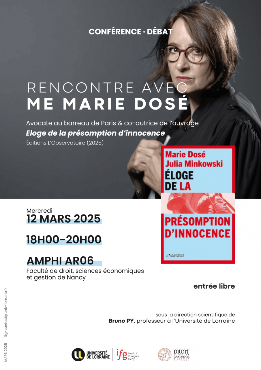 Marie Dosé, née à Essey-lès-Nancy (Meurthe-et-Moselle), est une avocate française spécialisée dans les affaires pénales. Elle est inscrite au barreau de Paris et viendra présenter son ouvrage, co-écrit avec Julia Minkowski, Éloge de la présomption d'innoncence (Éditions de L'Observatoire, 2025).